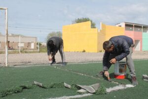 El equipo perteneciente a la Subsecretaría de Planificación y Obras Públicas realizan en la jornada de este viernes los trabajos de acondicionamiento en el Centro Recreativo Infantil, centrados principalmente sobre el césped sintético de las tres canchas.
