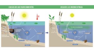 Las cianobacterias producen cianotoxinas de distinto tipo y le dan al agua un color verdoso o verdeazulado cuando están presentes en gran cantidad. Las que se han observado con mayor frecuencia en distintos cuerpos de agua son las microcistinas. “Estas toxinas son hepatotóxicas y pueden producir, entre otras cosas, irritación en la piel, daños en los ojos y problemas digestivos. Pero además, si la exposición es crónica, puede causar cáncer de hígado”, indica el investigador.