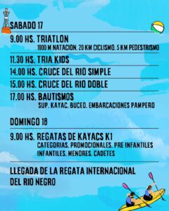 El sábado 17 la acción deportiva comenzará a las 9 con el Triatlón, mientras que a las 11:30 será el turno de los más pequeños en el Tria Kids. Por la tarde, la actividad se trasladará al agua comenzando a las 14 con el cruce del río simple, seguido a las 15 por el cruce del río doble. Para cerrar la jornada, a partir de las 17, se realizarán Bautismos de sup, kayak, buceo y diversas embarcaciones, permitiendo que el público tenga su primer contacto con estas disciplinas.
