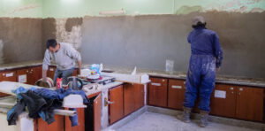 Las tareas pendientes se desarrollan en la Escuela Primaria 218 de Laguna Miranda, donde se trabaja en la impermeabilización y refacción integral de los baños.