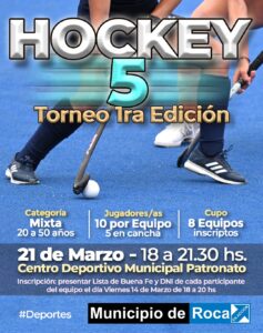 General Roca – El Municipio de Roca, a través de la Dirección de Deportes, invita a disfrutar de una jornada a puro hockey donde primará la diversión. El evento se llevará adelante el próximo viernes 21 de marzo a las 18 hs en el Centro Deportivo Municipal Patronato.