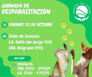 Mañana viernes 20 de octubre de 9:00 a 11:00 hs en las sedes de Zoonosis, Belgrano 1990 de San Antonio Oeste y Rogelio Cortizo 900 de Las Grutas, se realizará una nueva jornada de desparasitación interna y externa destinada a perros y gatos.