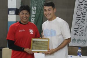 El Director de Deportes Gustavo Montiel hizo entrega de una placa en reconocimiento y agradecimiento por su visita y a través de imágenes proyectadas en un video se pudo ver el recorrido deportivo del jugador desde sus comienzos hasta su debut en primera división.