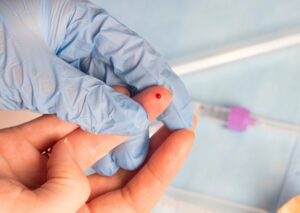 -Se pincha un dedo y se retira una gota de sangre para poner sobre la tira reactiva